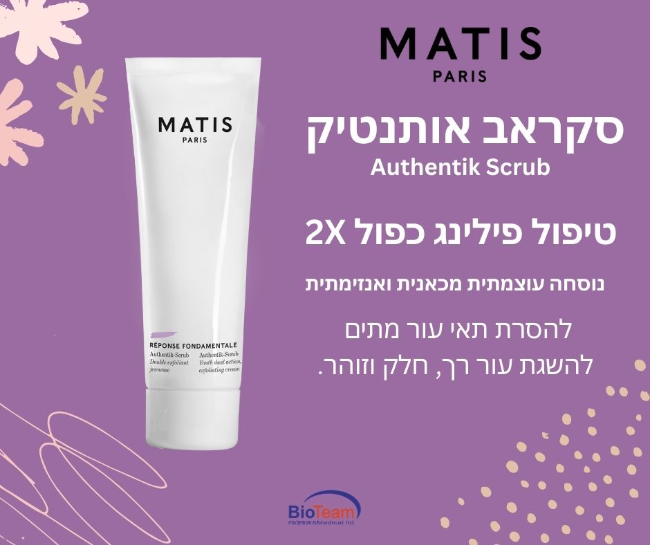 הכירי את סקראב אותנטיק מבית MATIS PARIS טיפול פילינג כפול, החיוני לחידוש ולהחלקת עור הפנים, תוך כדי שמספק תחושת נינוחות ורוגע לכל סוגי העור. בעל נוסחה עוצמתית וממוקדת ליעילות מוגברת, המציעה פעולת חידוש עור משולבת, מכאנית ואנזימתית. מכיל תמצית סחלב סגול, המתגברת את פעולת האנטי אייג'ינג. מסיר את תאי העור המתים ומותיר את העור רך, חלק וזוהר.